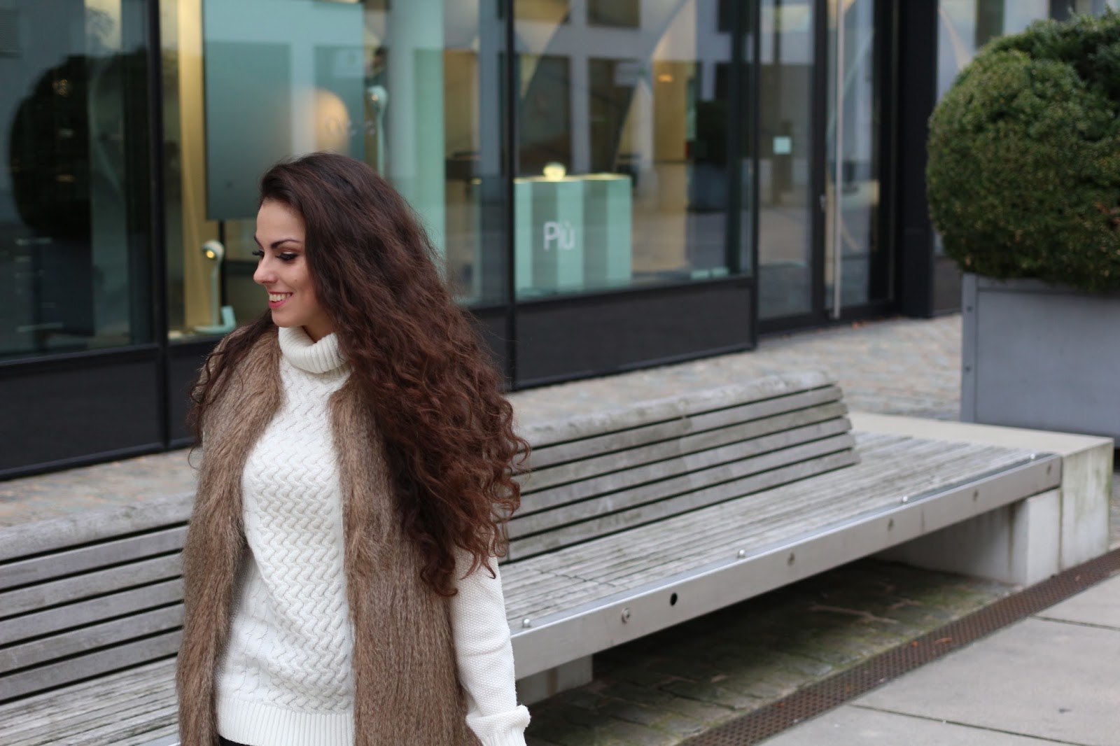 Mein Winteroutfit besteht aus einem weißen Rollkragenpullover und einer Fellweste
