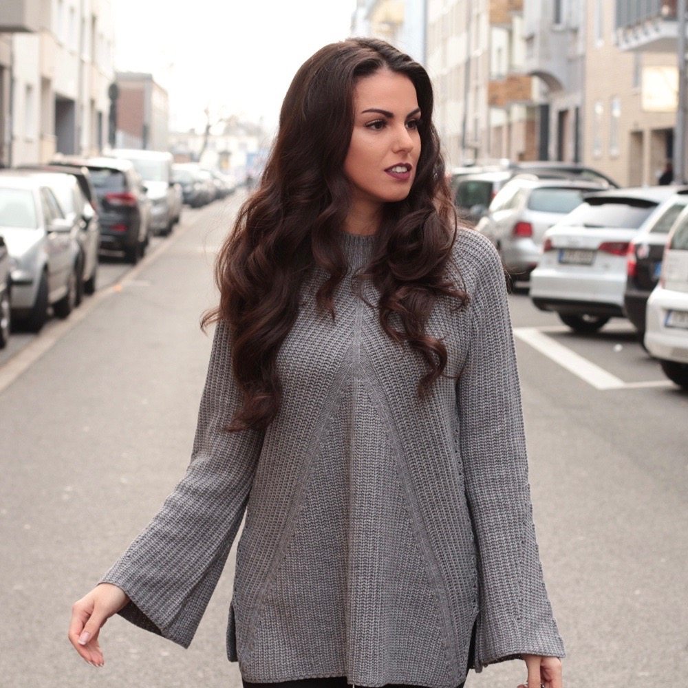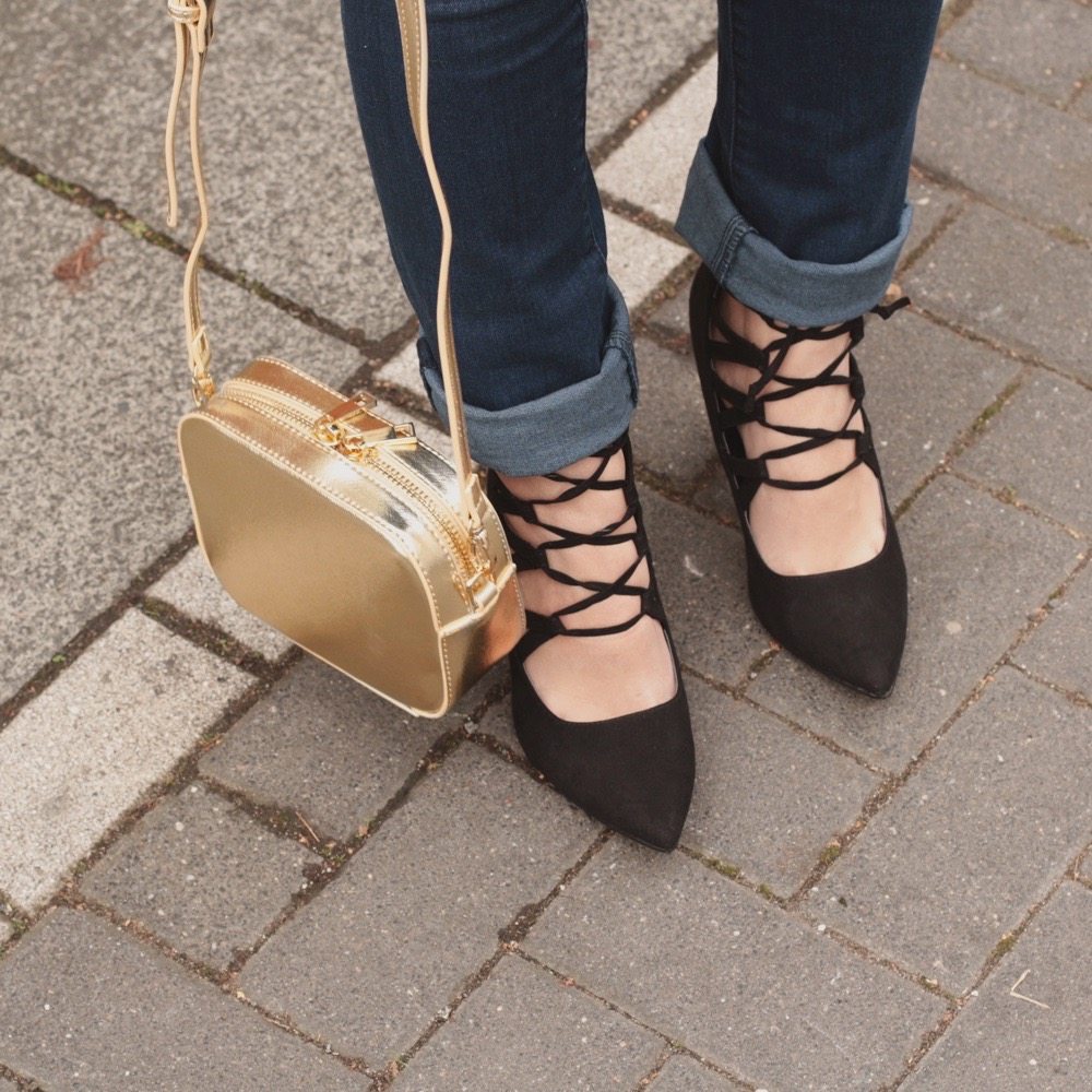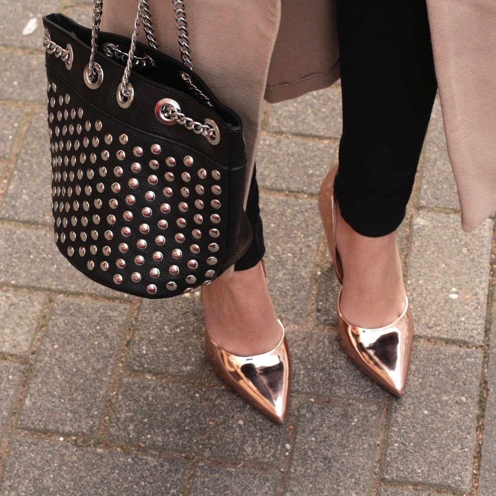 Will man es mal einen Tag ruhiger angehen lassen, kann man mit einem kuscheligen Pullover und schwarzer Jeggins absolut nichts falsch machen. Um jedoch nicht komplett casual auszusehen, wählt ihr am besten ein paar richtig coole High-Heels, wie zum Beispiel die goldenen Schuhe auf den Bildern. Selbst die rockige Tasche fügt sich sehr gut ein, wenn man bedenkt, dass es hier ein zwar gemütliches, zurückhaltendes aber dennoch festliches Outfit sein soll. Sollten die Heels irgendwann zu anstrengend werden, finden hier sogar noch ein paar Ballerinas Platz 🙂