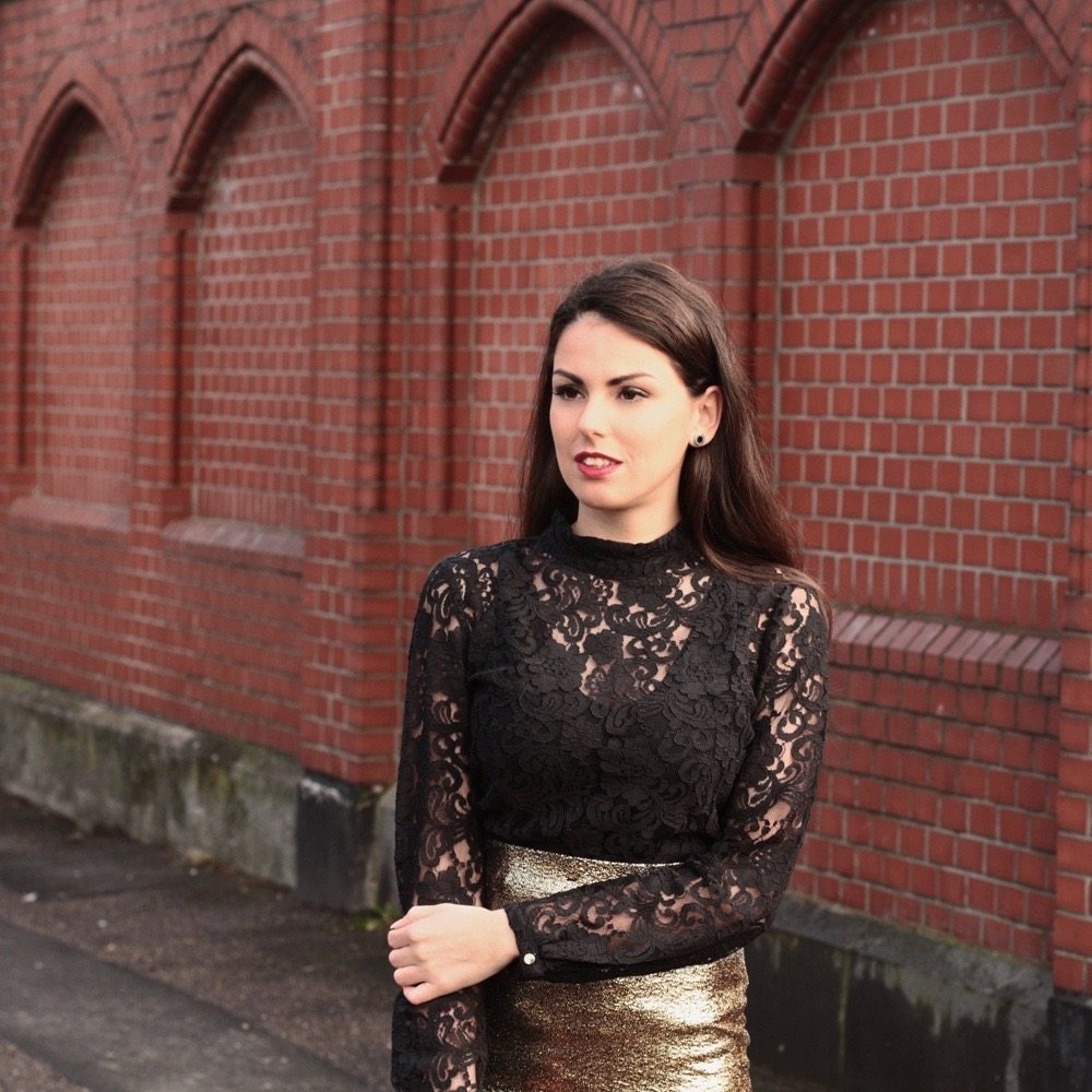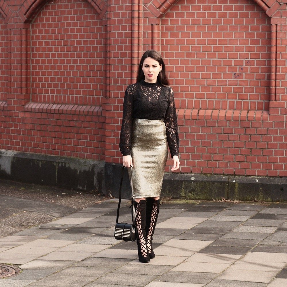 Die Kombination von Spitzenbluse und glitzerndem Bleistiftrock trage ich vor allem bei schickeren Anlässen, z.B. beim Restaurantbesuch an einem der kommenden Feiertage. Die Schnürboots heben das Outfit auf das nächste Level, schließlich will man ja nicht immer direkt so aussehen, als würde man gerade aus dem Büro kommen 🙂
