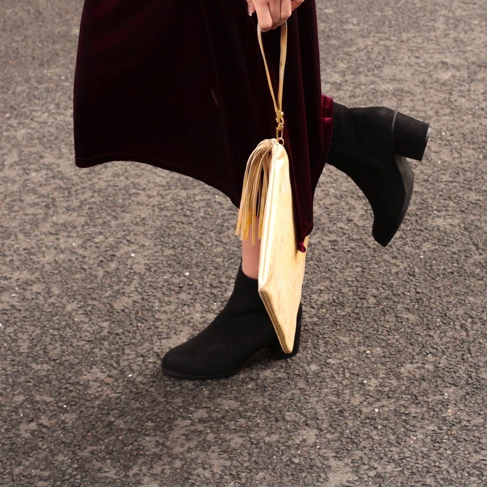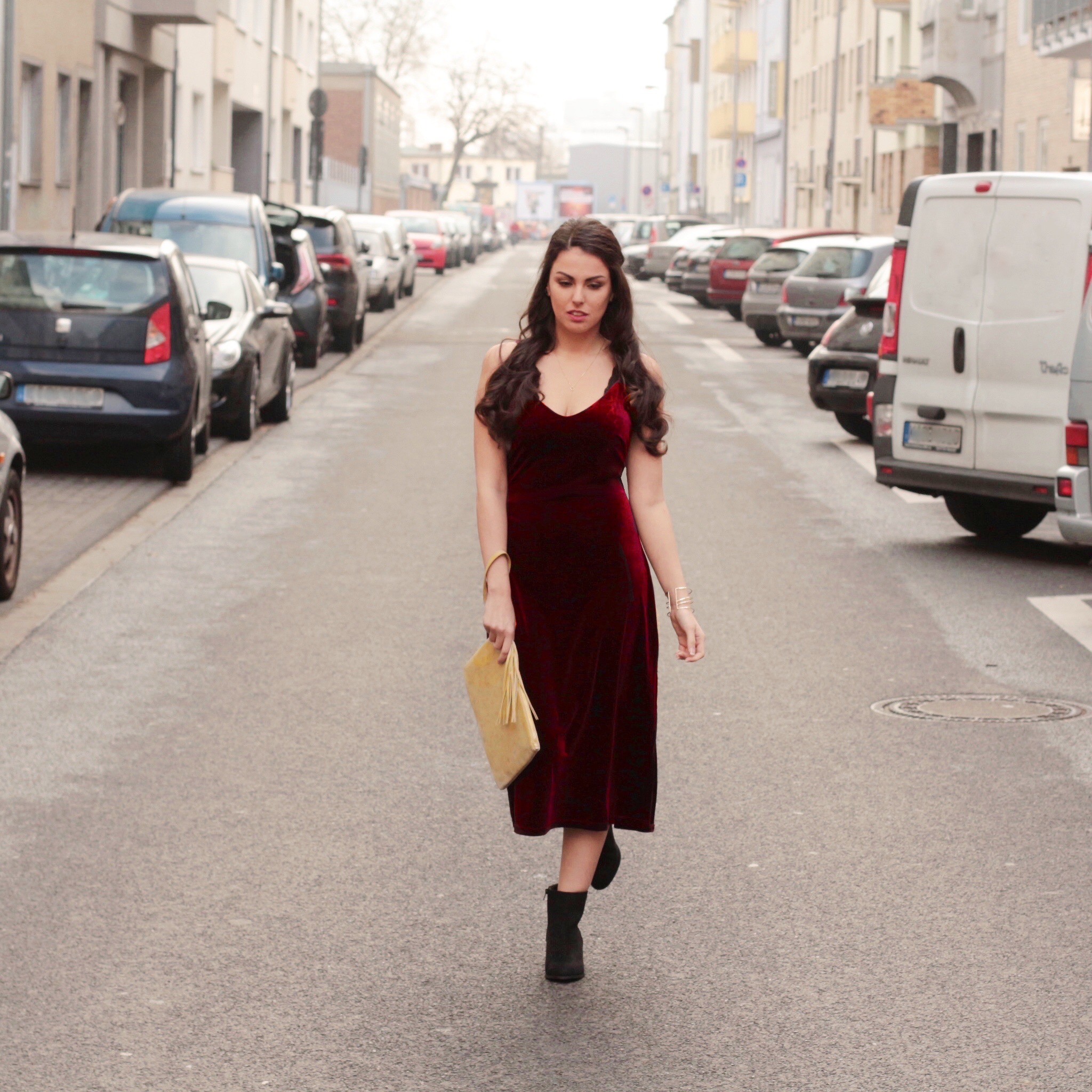 Samt ist zurück, mal wieder 🙂 Welche Farbe passt wohl besser in die Weihnachtszeit als rot? Zusammen mit einer goldenen Tasche und den coolen Boots ist dieses Outfit sehr vielseitig. Ob auf der Arbeit mit einem schönen Blazer, oder zum Ausgehen mit Lederjacke und High-Heels, hier seht ihr den meiner Meinung nach vielseitigsten Style.