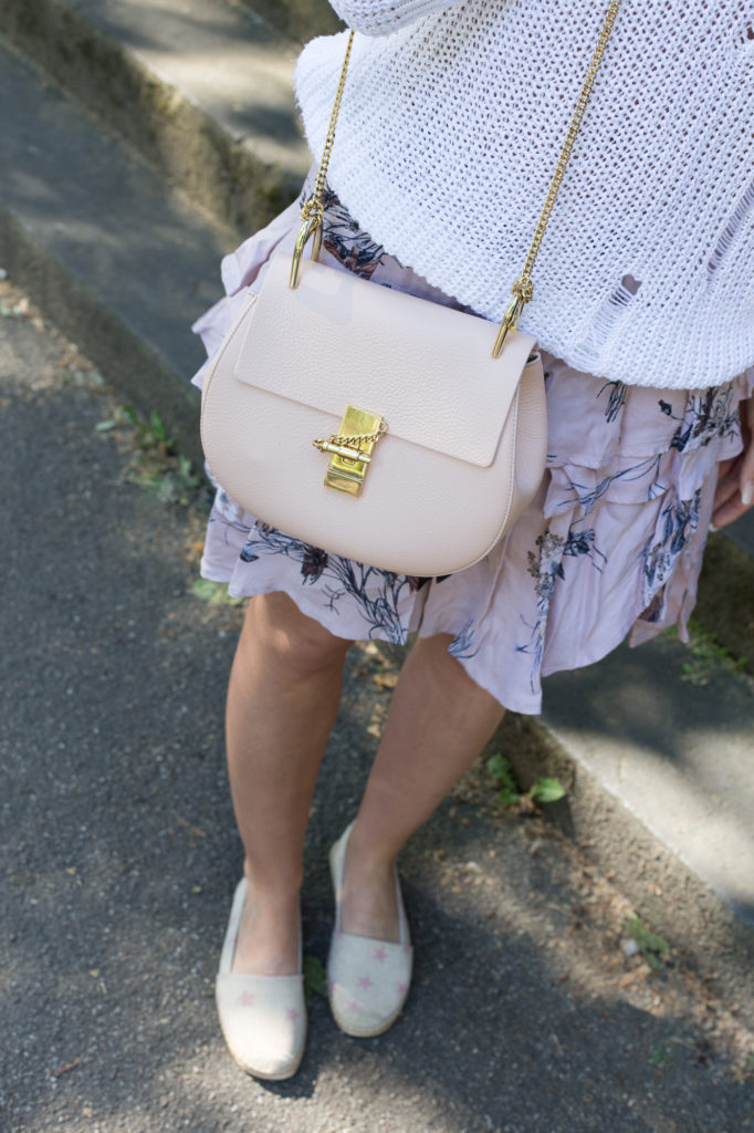 Das allerwichtigste ist, dass ihr in der Farbfamilie bleibt, die euer Keypiece hat, in unserem Fall hier der Blumenrock. Neben rosé erkennt ihr auch noch dunklere Nuancen wie blau, lila und braun. Auch diese Farben wären für eine Kombi in Frage gekommen. Dem Anlass entsprechend habe ich mit für ein total neutrales Oberteil in weiß entschieden, aber auch hier zählen wieder die Details. Durch die used-Optik ist alles nicht so langweilig, wie ich finde.