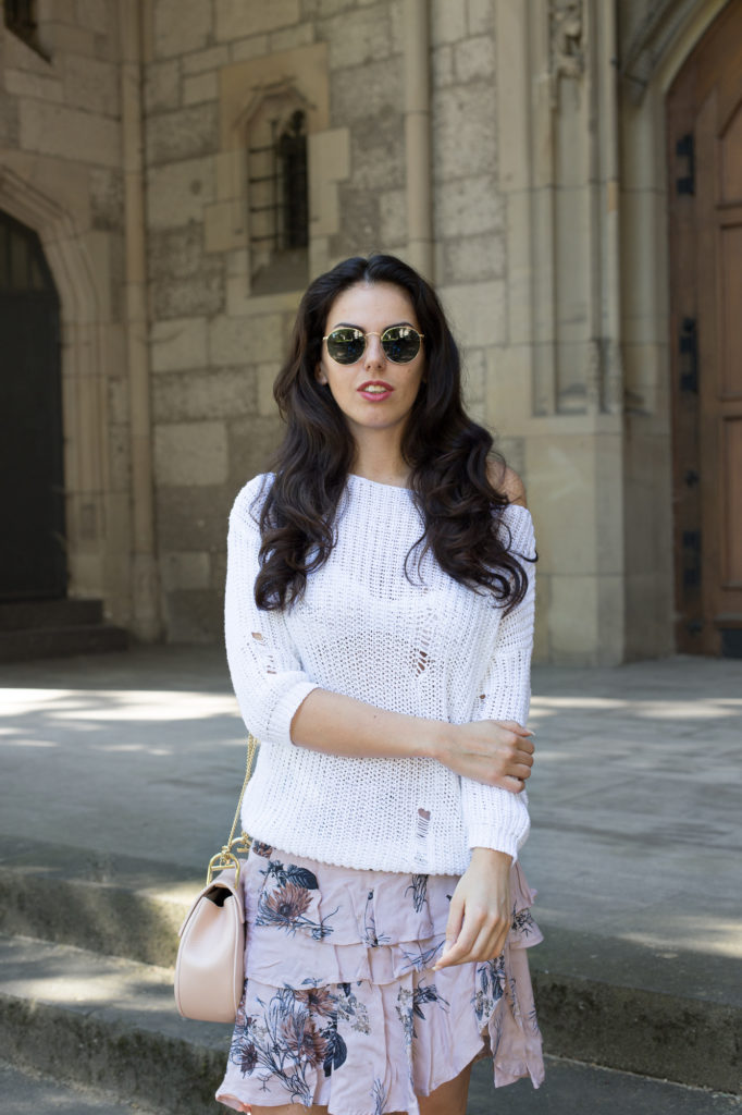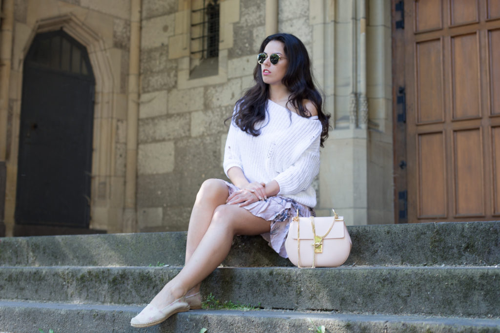 Normalerweise trage ich kaum Röcke, doch ich habe mich in diesen wunderschönen Blumenrock verliebt und konnte nicht anders, als ihn mir zu schnappen. Dazu habe ich einen weißen Strickpullover und beige Espadrilles mit rosa Sternchen kombiniert. Der Sommermodus ist bei mir direkt angesprungen, als das Thermometer über 25 Grad gestiegen ist.