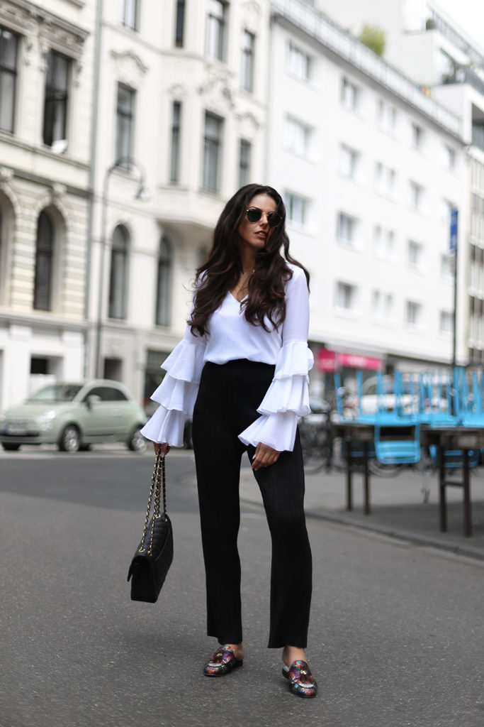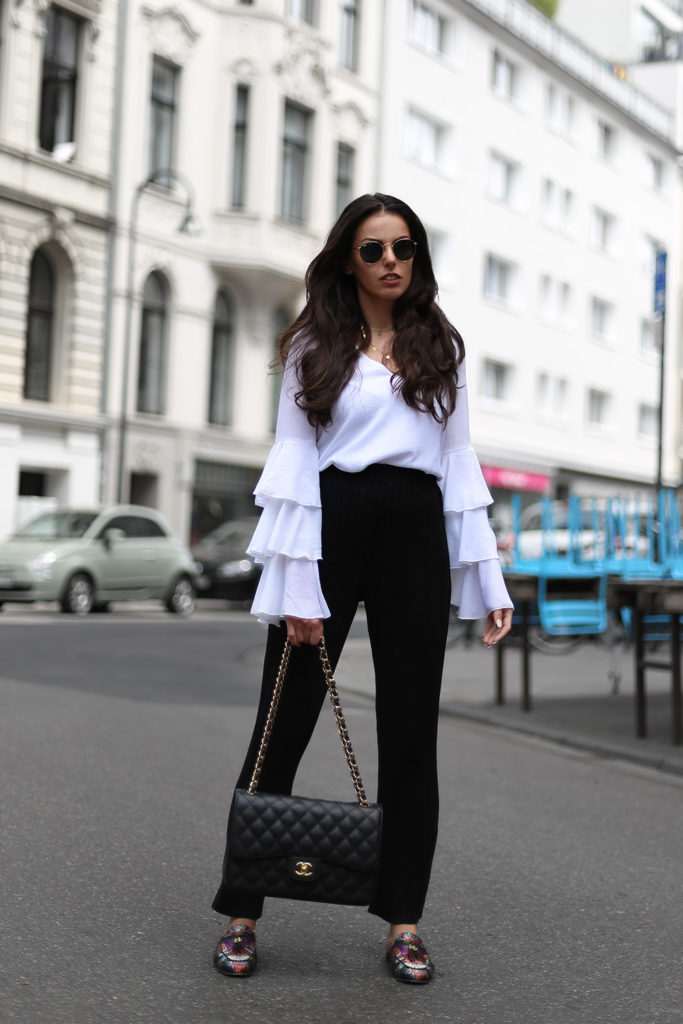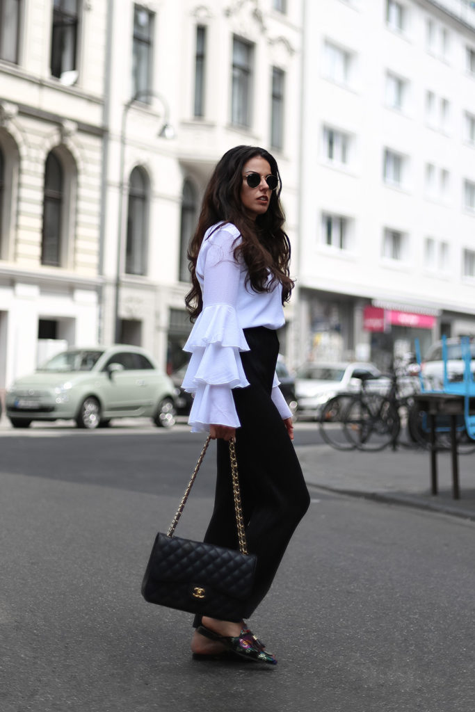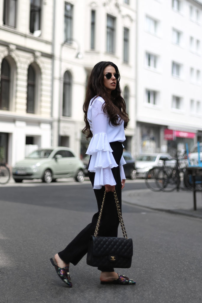 Das Outfit sieht super aus. Volants sieht man zur Zeit ja überall und nachdem ich mich etwas dran gewöhnt habe, finde ich es jetzt sogar richtig schön. Dein Look mit der weißen Bluse und der weiten schwarzen Hose steht dir wirklich gut. Die klassische Tasche und die bunten Schuhe peppen alles noch auf. Top Look!