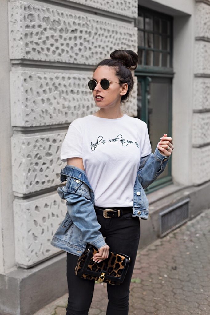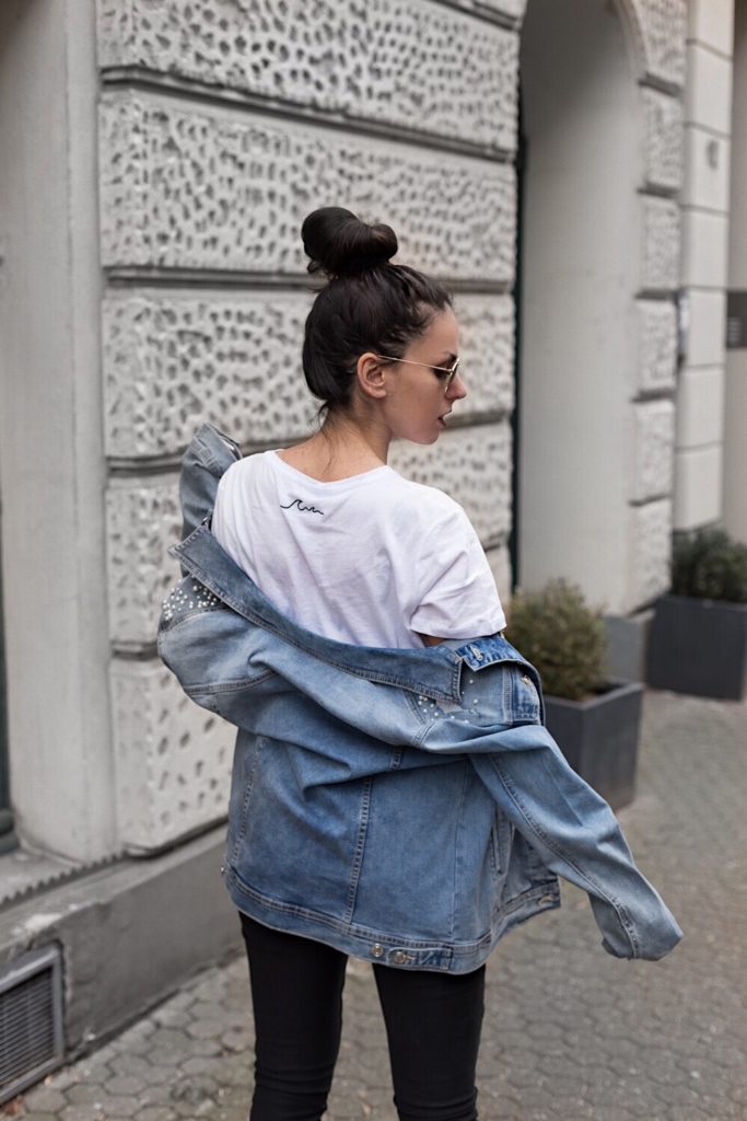 Ok, die Denim-Jacke ist ein richtiges Multi-Talent und vor allem jederzeit und auch mit nahezu jedem Outfit tragbar. Als ich dann dieses Stück gesehen habe, war es um mich geschehen und ich musste sie haben 😀 Sie ist etwas im Oversize Look geschnitten, mit diversen Used-Elementen und einer coolen Waschung. Ein bisschen Rock ’n‘ Roll schadet keinem Look, vor allem, wenn man tagsüber unterwegs ist und es mal schnell gehen muss – Denim-Jacke drüberziehen und los geht’s.