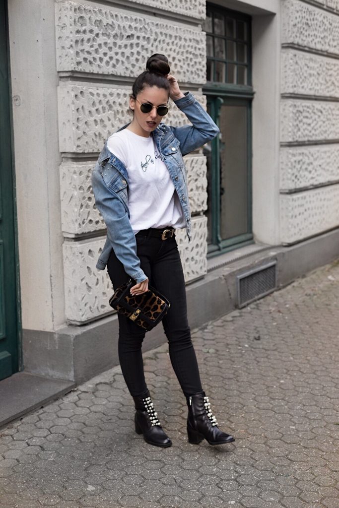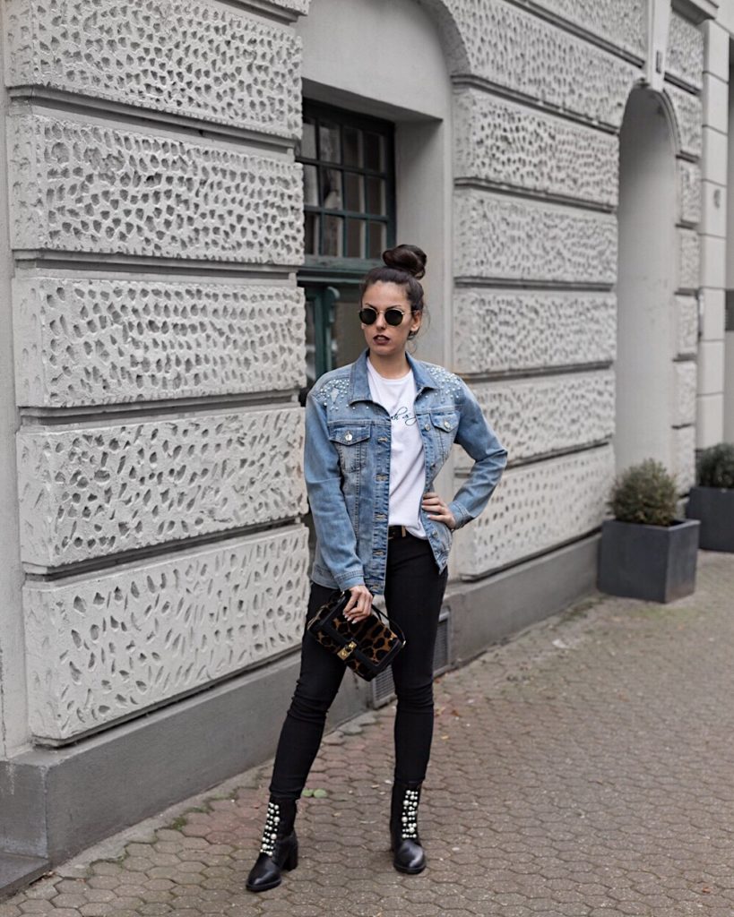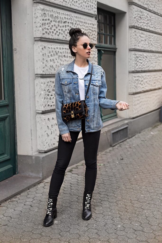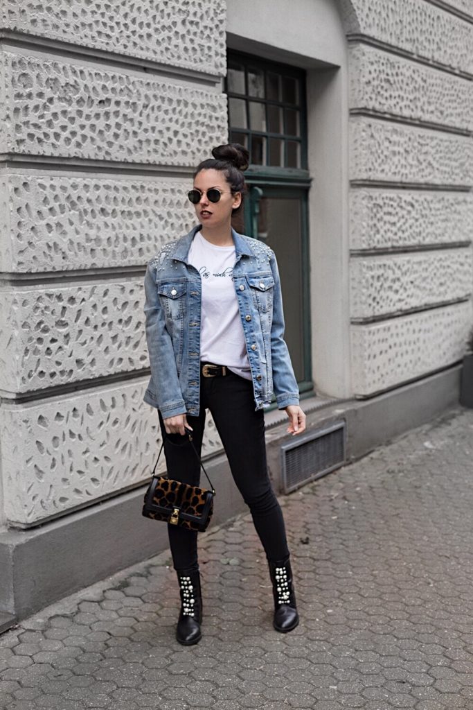Um das Thema der Jacke wieder aufzunehmen, trage ich schwarze Boots, die ebenfalls mit Perlen besetzt sind 🙂 Mit einer klassischen schwarzen Jeans hebe ich die anderen Kleidungsstücke hervor. Gerade die Kombination ist so vielseitig und kann mit so vielen anderen Trends in Verbindung gebracht werden.