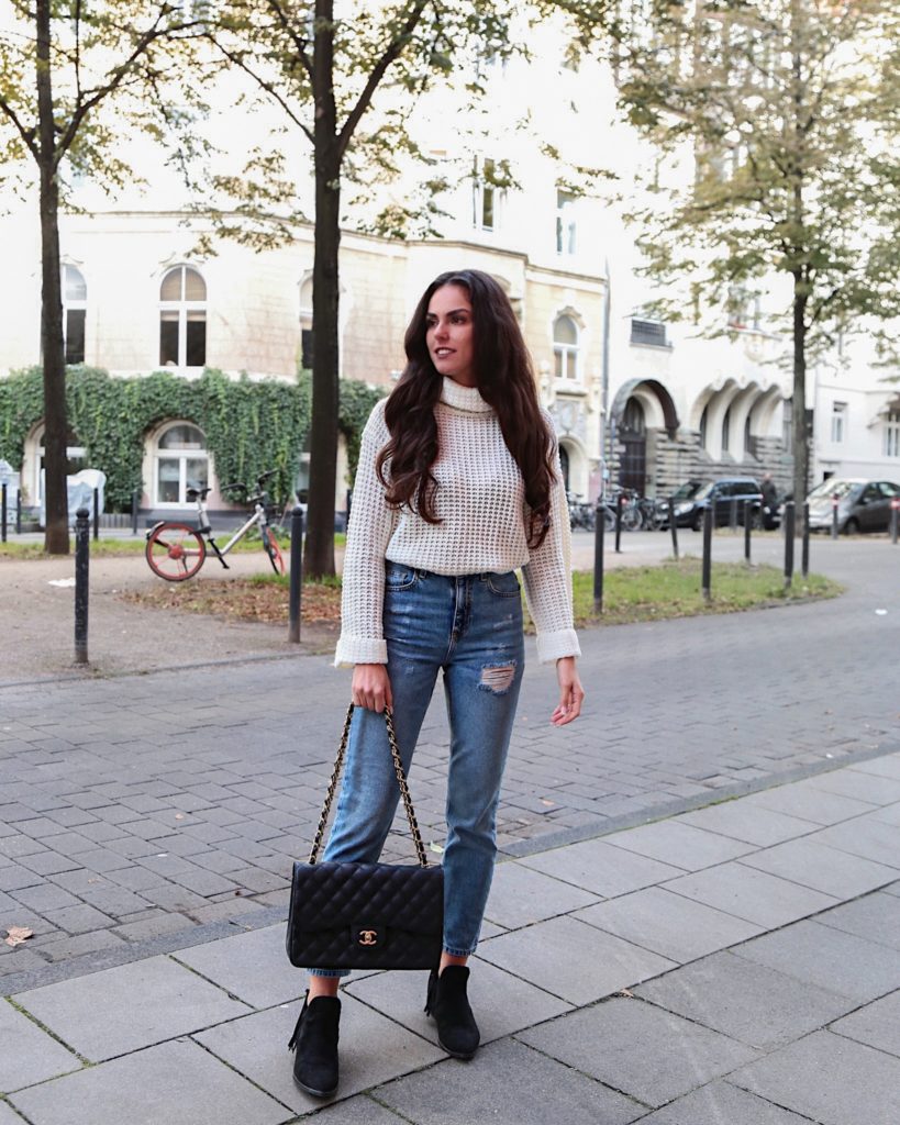 Bei diesem Look habe ich zwei Trends kombiniert. Die Mom Jeans ist schon seit einiger Zeit im Trend und wird auch noch was bleiben. 🙂 In diesem Jahr kommen auch die Fransen bzw. der Western Style zurück, was für mich ehrlich gesagt noch etwas Zeit braucht, um mich darin wohl zu fühlen. Aber um mich da langsam drauf einzustimmen, habe ich schlichte Boots mit Fransen gewählt, quasi ein Mini-Western-Detail. 🙂