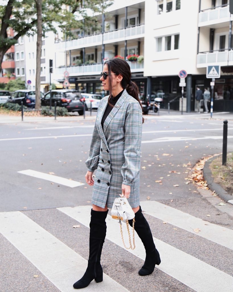 Karo Muster sind auch in diesem Jahr wieder der Hingucker und können vielfältig eingesetzt werden. In diesem Fall habe ich ein Karo Kleid mit Overknees kombiniert. Eigentlich im Business stark vertreten, kann man auch lässiger kombinieren und gewagtere Schnitte wählen – warum? Weil wir beim brunchen ja nicht unbedingt aussehen wollen, als würden wir gleich eine Präsentation halten wollen, auch wenn dieses Herbstoutfit durchaus dazu tauglich wäre :-).